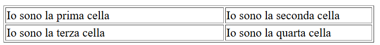 bordi ma prima di fare questo è necessaria una doverosa precisazione.![]() In questa immagine, che già conoscete, dobbiamo precisare una cosa, ossia, che questa tabella è formata da due righe, quattro celle e due colonne, una sinistra e una destra. Era giusto dirvelo per il proseguo della lezione. Bene, proseguiamo. Ora daremo una dimensione totale alla tabella utilizzando un nuovo Tag, il Tag width che dimensionerà la tabella in lunghezza: <body> <table width="900pxl" border="1pxl"> <tr> <td>Io sono la prima cella</td> <td>Io sono la seconda cella</td> </tr> <tr> <td>Io sono la terza cella</td> <td>Io sono la quarta cella</td> </tr> </table> </body> Ora la nostra tabella misura 500pxl e, automaticamente le due colonne misureranno 450pxl ogniuna. <body> <table width="500pxl" border="1pxl"> <tr> <td>Io sono la prima cella</td> <td>Io sono la seconda cella</td> </tr> <tr> <td>Io sono la terza cella</td> <td>Io sono la quarta cella</td> </tr> </table> </body> Ora vogliamo che una colonna (formata da due celle) misuri 300pxl: <body> <table width="500pxl" border="1pxl"> <tr> <td width="300pxl">Io sono la prima cella</td> <td>Io sono la seconda cella</td> </tr> <tr> <td>Io sono la terza cella</td> <td>Io sono la quarta cella</td> </tr> </table> </body> In questo modo la prima cella di sinistra misurerà 300pxl, ma anche quella sotto, la terza cella misurerà 300pxl in quanto facente parte della stessa colonna. Per realizzare una tabella precisa al massimo, dovremmo dimensionare la colonna di destra attribuendole una lunghezza di 200pxl (500-300=200) quindi: <body> <table width="500pxl" border="1pxl"> <tr> <td width="300pxl">Io sono la prima cella</td> <td width="200pxl">Io sono la seconda cella</td> </tr> <tr> <td>Io sono la terza cella</td> <td>Io sono la quarta cella</td> </tr> </table> </body> ![]() |